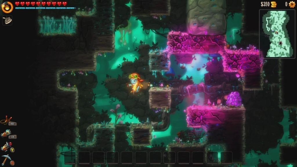 The game is a sequel, and follows the adventures of Dorothy the robot as she goes searching for the protagonist of the first game Rusty. Starting off in the hub world of El Machino, she ventures down into the mines to find him with her trusty pickaxe. The main draw of the game is that as you dig, you find jewels, and gold which can be traded in at El Machino for powerups, as well as new weapons. The story continues to progress as you get deeper and deeper into the mine, and the whole story borders a fine line between charm and a dark underbelly.