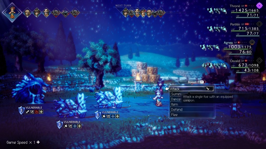 Each attack as well, you can also choose to boost your attack or skill, up to 4 times. If you don’t boost an attack, you will earn a boost point that can be used later. This becomes a very important mechanic, especially later in the game when you desperately need to break an enemy before they wipe your party with a super attack.